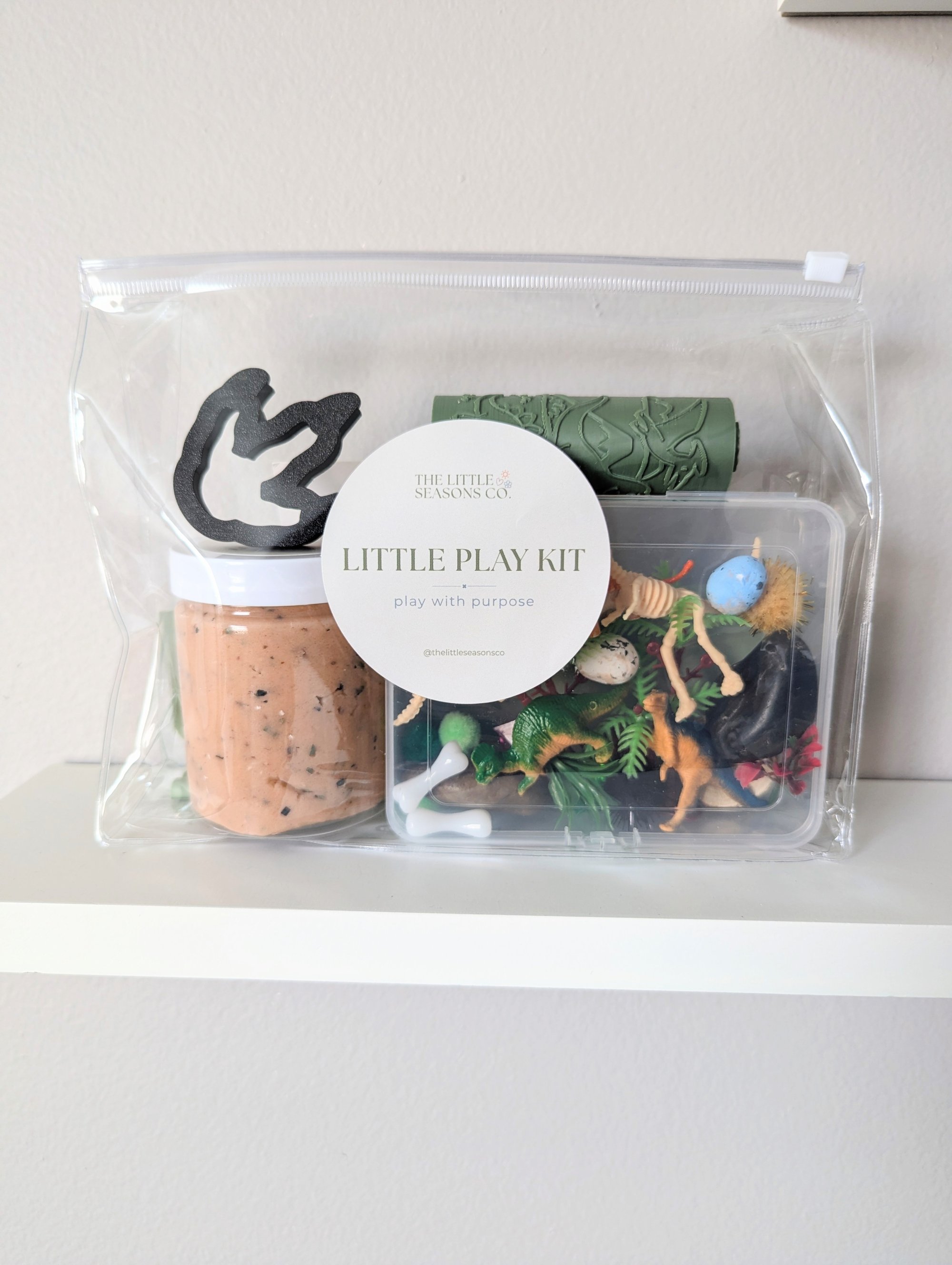 Soft sensory play dough and dino-themed play pieces for calm, creative, and open-ended fun—thoughtfully packed for play at home or on the go.